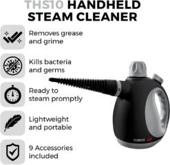Tower T134000PL THS10 Corded Handheld Steam Cleaner with 9 Accessories, 1050W, Platinum