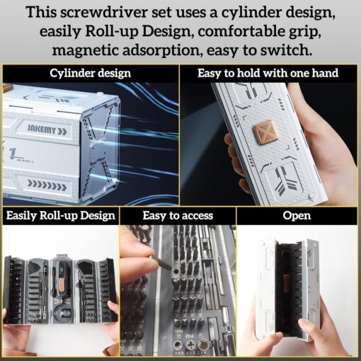 This180-in-1screwdriversetisdesignedwithatech-savycontainer designthatsavescarryingspace andiseasytostore.The five-fold folding formof