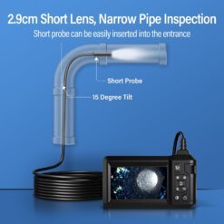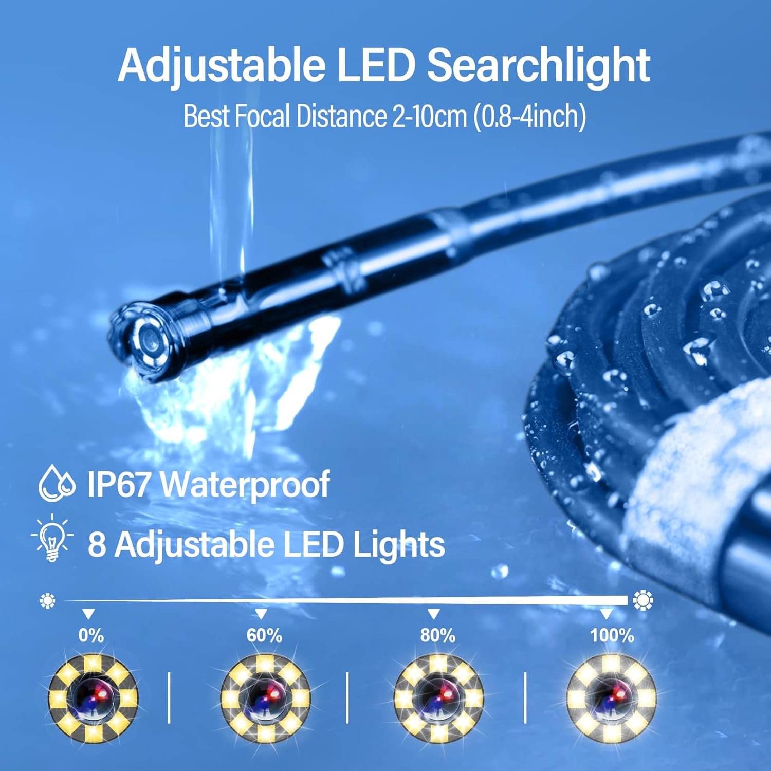 - Endoscope Camera: Endoscope camera with 8 LED lights, 8mm camera head, IP67 waterproof and 3 adjustable brightness levels to ensure a clear image even under dark condition; Drain camera best focusing distance is 0.79~3.93 in; FOV 70°, one-button 180° rotating to switch pipe camera orientation for better observation; 16.5 feet Semi-Rigid cable is both stiff and flexible to better meet your needs
