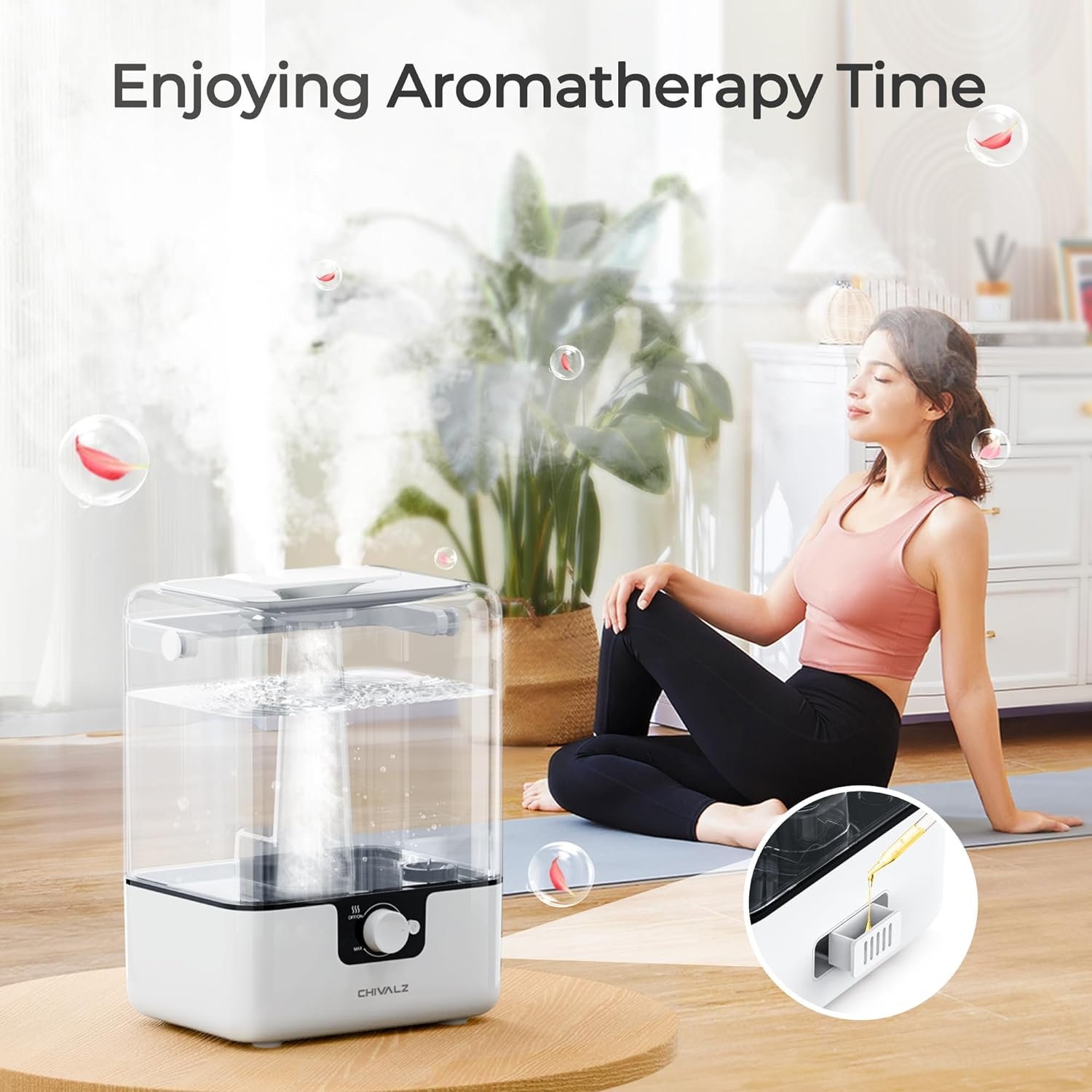 - 2-IN-1 Cool Mist Humidifier and Diffuser: Ultra fine cold mist up to 300ml/h can quickly add moisture to the air in large rooms, helping to alleviate cough, dry skin, colds, sinus problems, and other issues caused by air dryness. The humidifier is recommended to use distilled water and purified water for better health benefits. Put cotton pads with added essential oil in a dedicated oil tank and adjust the nozzle of the humidifier to aim the mist and scent to where you need it most. Note: Do not drip essential oil directly into the water tank