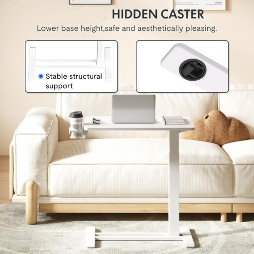 - Easy to move around & space-saving: standing desk overbed table is equipped with 4 hidden casters to easily maneuver it anywhere you like. It’s an ideal portable workstation for any home or office! A low-profile base with smooth rolling wheels eases and tuck beneath furniture to save space.