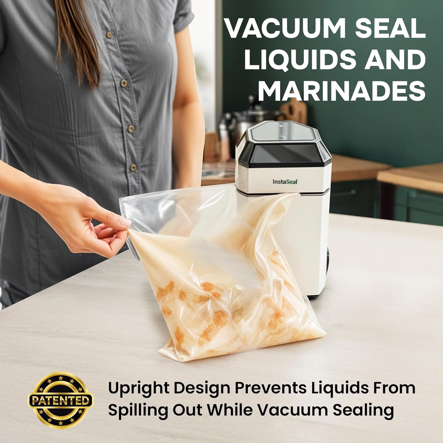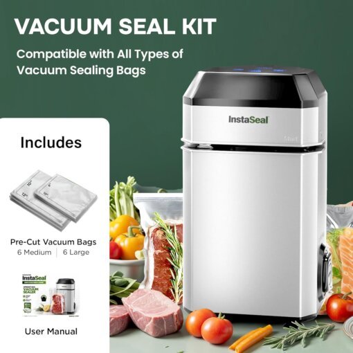 - INSTASEAL VACUUM SEALER MACHINE: Get started with everything you need, including the space-saving Insta Seal upright food sealer vacuum sealer for food, user manual, and AC electrical cord, and a set of 12 pre-cut bags. The no-leak design prevents spills, while the airtight double seal locks in flavors.