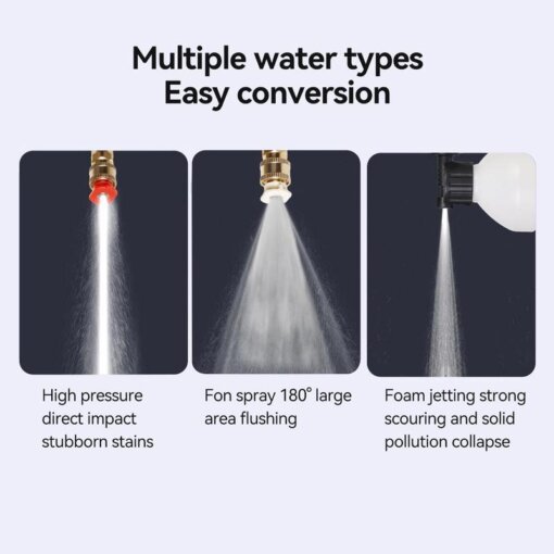- Can Switch Water Type: Our cordless pressure washer can switch water type at will, by changing nozzles, water flow can be gradually adjusted from small to large, 3 water types adjustable. As well as foam spray cans to meet your different needs