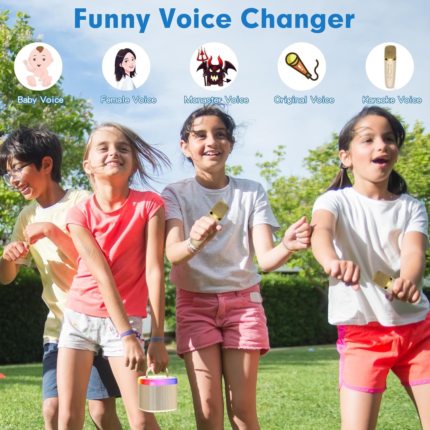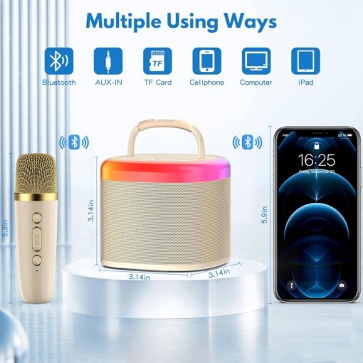 - ♪【Funny Voice Change & LED Lights】With 4 kinds of magic sound, including original, KTV, monster and felmale voice,this Bluetooth party speaker is providing endless fun for kids. Get the party started with our karaoke machine, enhanced with dynamic dancing lights that infuse your party with joy and energy.