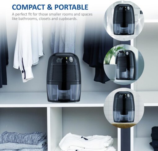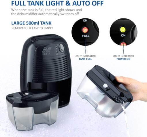 - REMOVES MOISTURE: This NETTA 500ml Dehumidifier is the ideal addition to any home. It can extract up to 300ml of excess moisture from the air per day (depending on conditions – recommended working environment is over 15°C and Over 40% Relative Humidity). The detachable water tank makes emptying the appliance quick and easy.