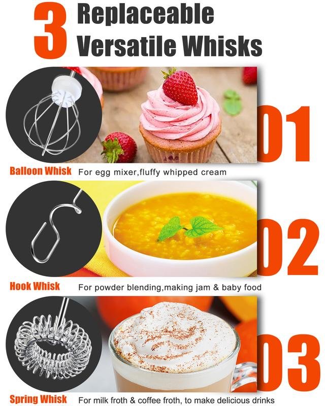 - Comprehensive Functions: This frother has three types of coffee whisk heads to meet various frothing needs. The spring whisk head is specially designed for coffee milk froth, the balloon whisk head is suitable for whipping cream, condensed milk, and eggs, and the hook whisk head is good at mixing powders such as protein powder and oatmeal.