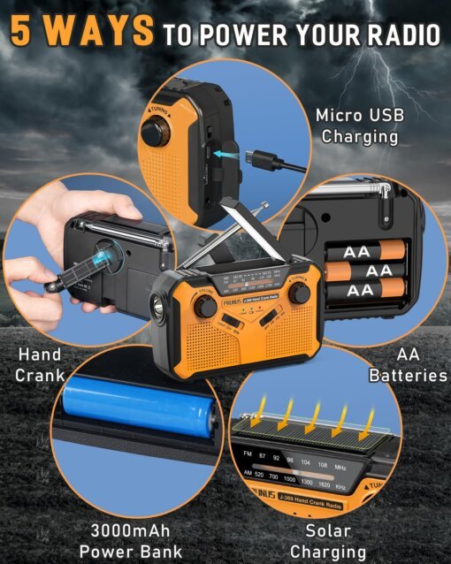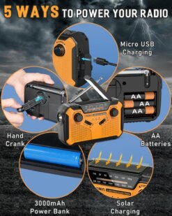 - 5 Ways to Power Supply: When power by 3 x AA batteries (you gotta bring ’em yourself), it allows you to use the emergency radio hand crank solar, am/fm/sw noaa weather radio to get weather information even when the power is out. The built-in 3000mAh non-removable rechargeable battery can not only power the radio, but also charge your phone in case of emergency. Micro USB is the main way to charge rechargeable battery. Hand crank and solar panels are an essential addition to an emergency (Note: Those can only charge the rechargeable battery of the radio, and can’t charge the AA battery).