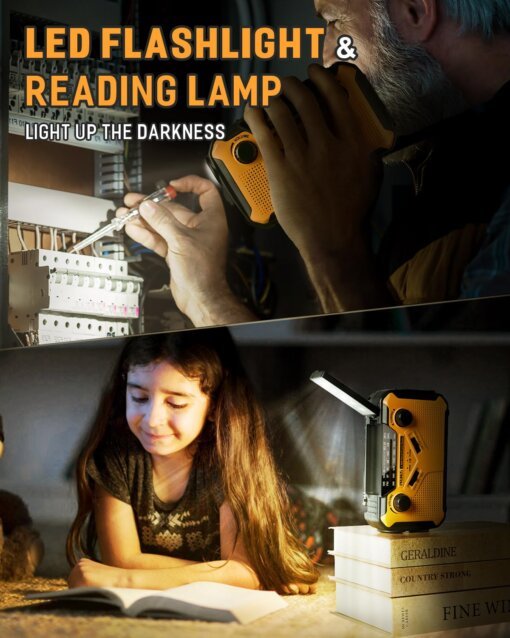 - LED Flashlight & Reading Lamp: This hand crank radio with its flashlight and reading lamp is a must-have for all you outdoor junkies and folks who find themselves walking in the dark during blackouts. The LED flashlight is bright enough to light up your path, so you won’t trip over every twig and stone when nature calls in the middle of the night. Pop out that solar panel, you’ve got a reading lamp that covers a bigger area.
