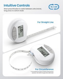 - Two measuring modes – Two measurement modes meet your needs: [Length mode] and [Body circumference mode]. The symbol “-” on the display is for length measurement and the symbol “O” is for body circumference measurement. You can long-press the [M] button to switch between the two modes. Note: The circumference measurement is 2.1cm/0.84inch longer than the length measurement, as it includes a gap between the tape head and the tape receptacle while circumference measuring for accurate results.