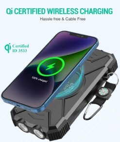 - Multi-Purpose Outdoor Power Bank: Portable solar charger is made to be IPX5 waterproof, dustproof and shockproof. The built-in dual super bright flashlights and the included compass carabiner can further ensure your safety when traveling outdoors, making it an ideal companion for outdoor enthusiasts.