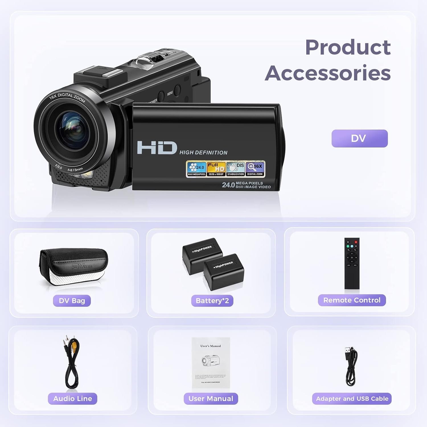 - 【REMOTE CONTROL& PAUSE FUNCTIONS 】 This hd camcorder is equipped with a remote control. Using this remote control,you can take photos and videos by anywhere, anytime. 16X Super digital zoom giving you a fantastic view of the scenery way in the distance. Besizes, Camcorder supports Pause Function, you can continue the recording in the same File without restarting a new one,a good Video Camera for YouTube Vlogging.